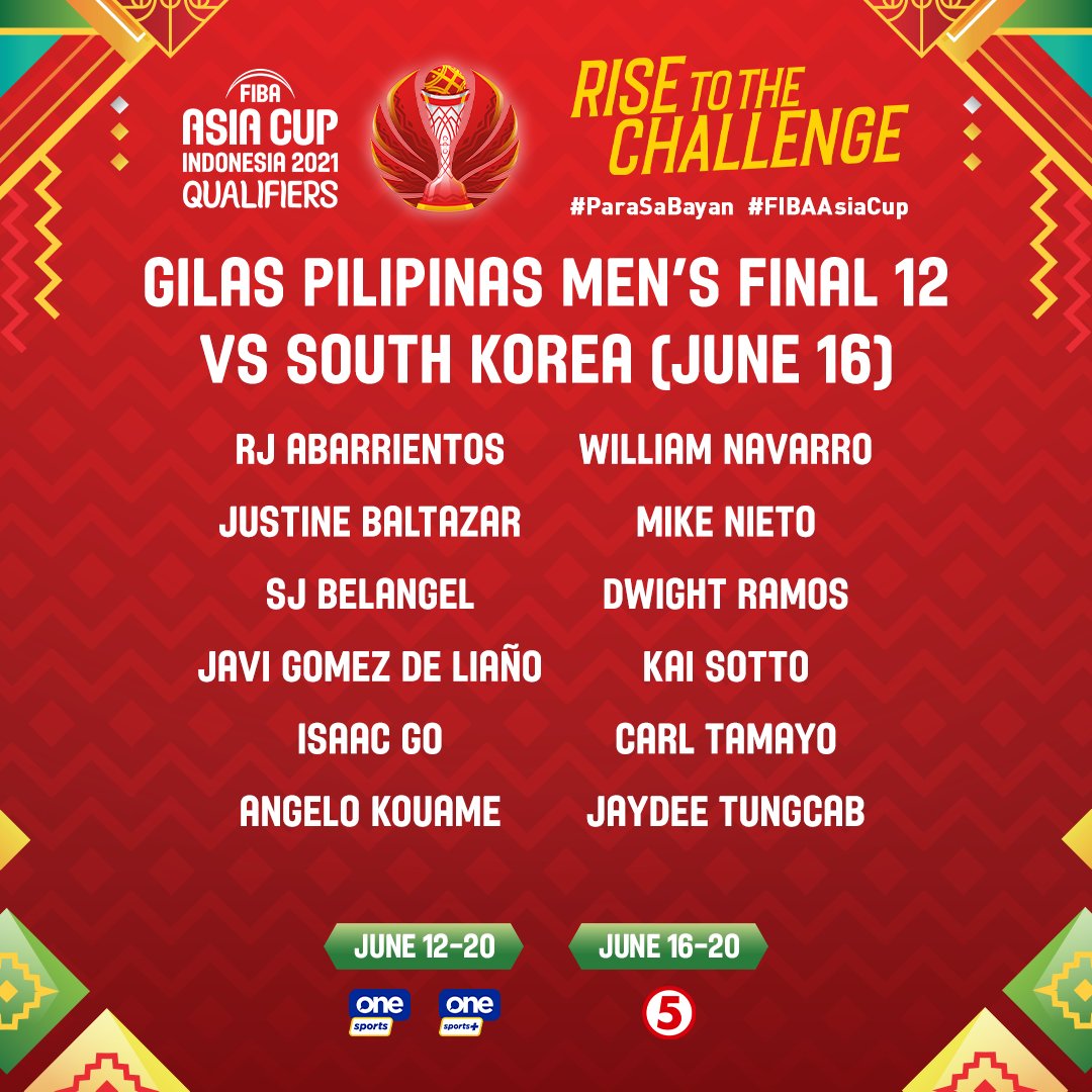 Manila, philippines — gilas pilipinas coach tab baldwin didn't need a lengthy motivational. 'lucky' gilas fired up vs korea. 2021 fiba asia cup qualification venue:… read more posted on may 15, 2021 june 17, 2021 football schedule and replay videos Gilas needs just one more win to qualify for the fiba asia cup 2021. Gilas pilipinas official line up are the following kai sotto, ange kouame, isaac go, rj abarrientos, justine …